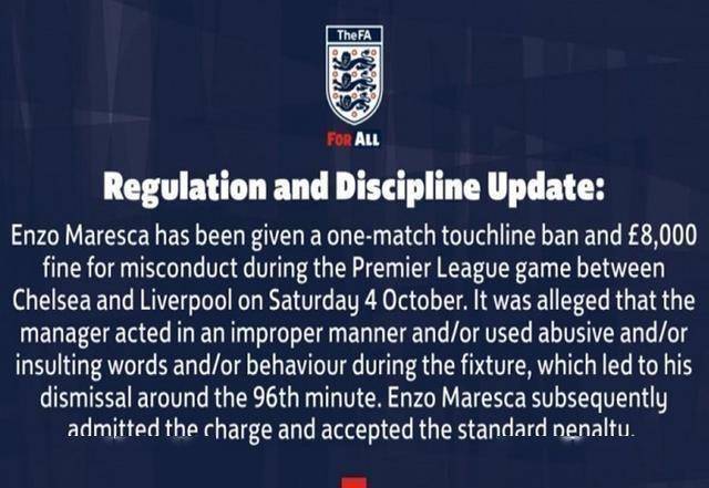摘要禁赛、罚款!切尔西遭重击,没有主帅或许更妙,马雷斯卡承认现实该来的躲不掉,切尔西这回摊上大事了。英足总敲锤宣布:马雷斯卡吃到禁赛,还得搭上8000英镑的罚款票子。这两周蓝军球迷脑袋都炸了,红牌跟下雨似的,一场接一场砸下来。